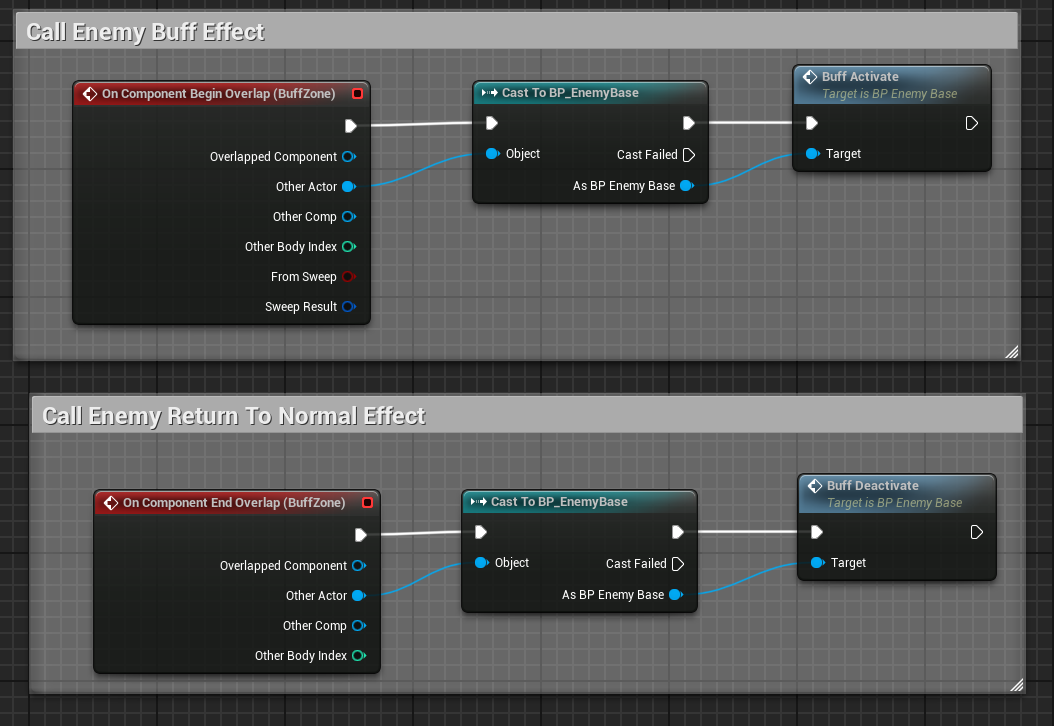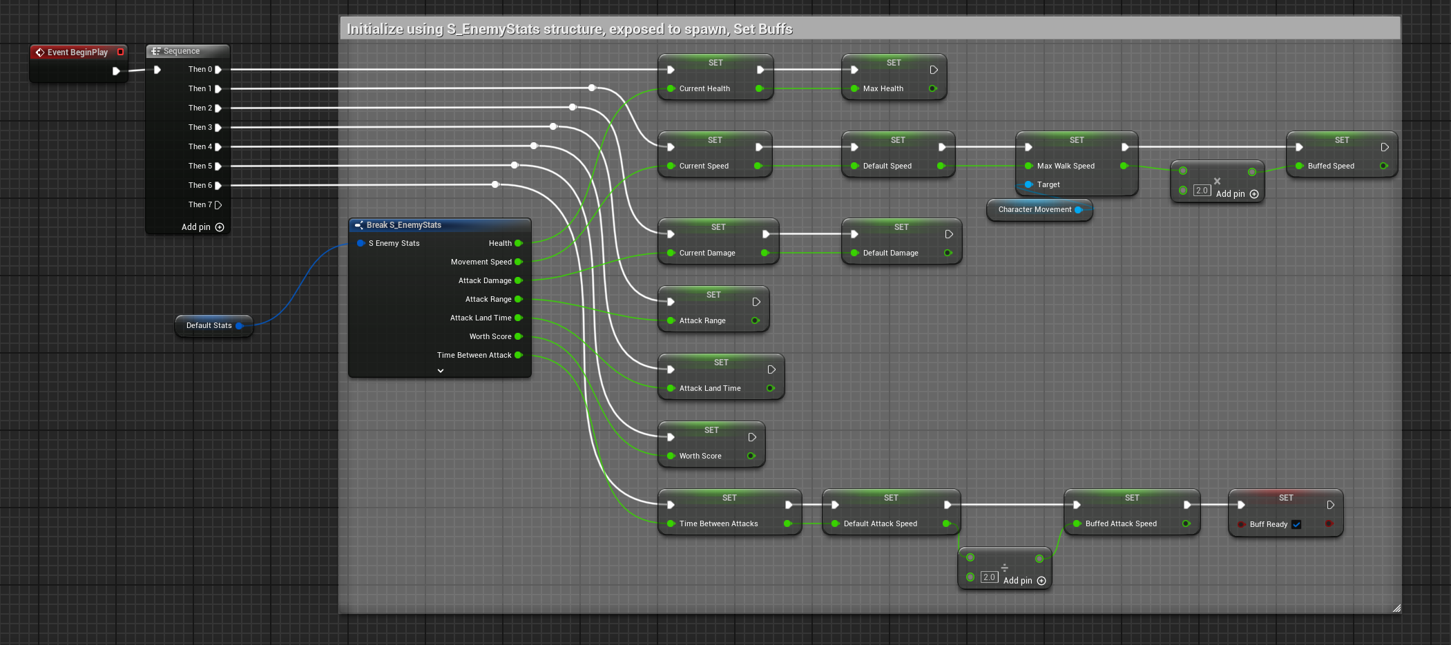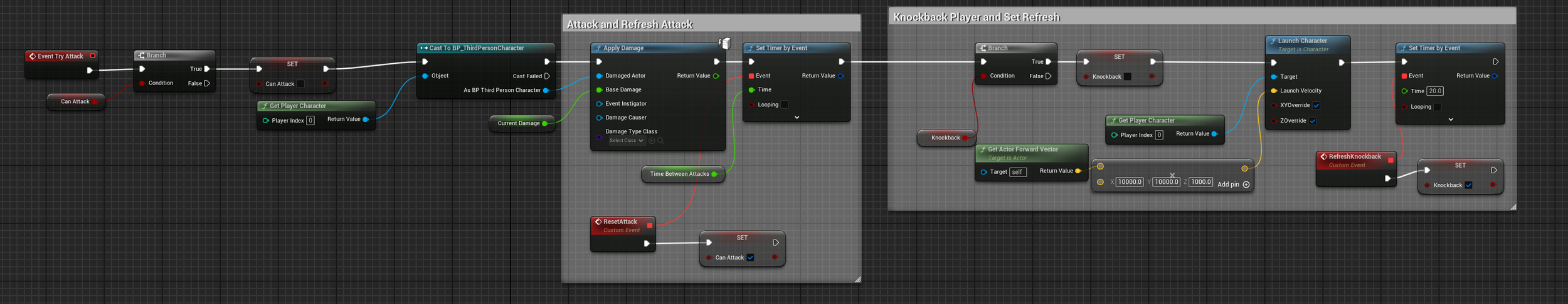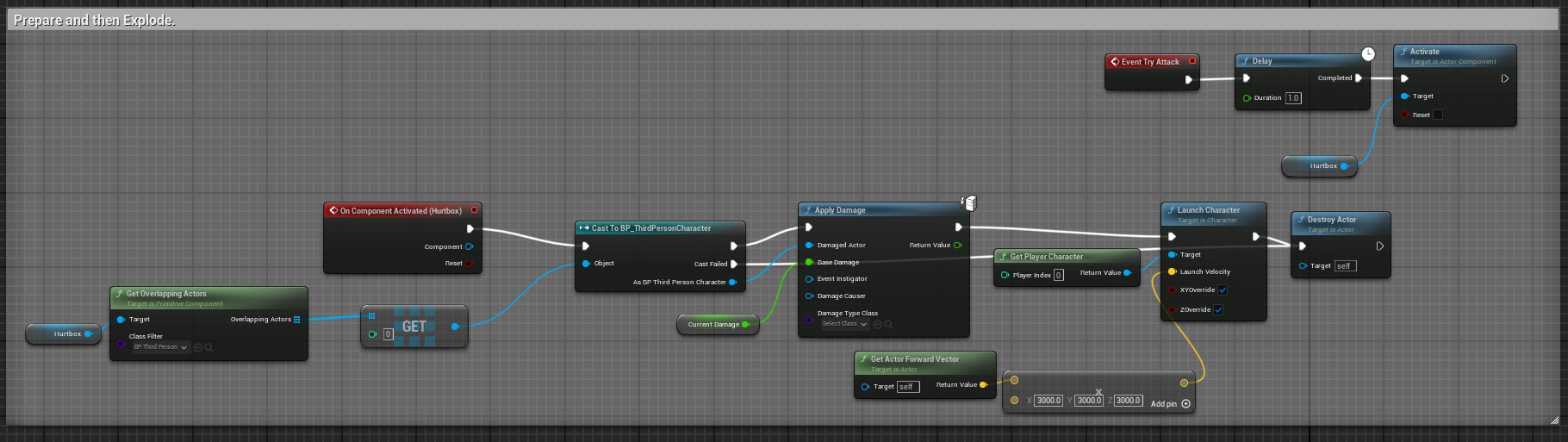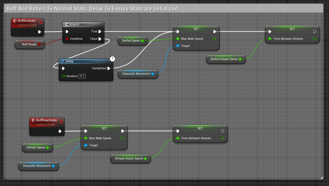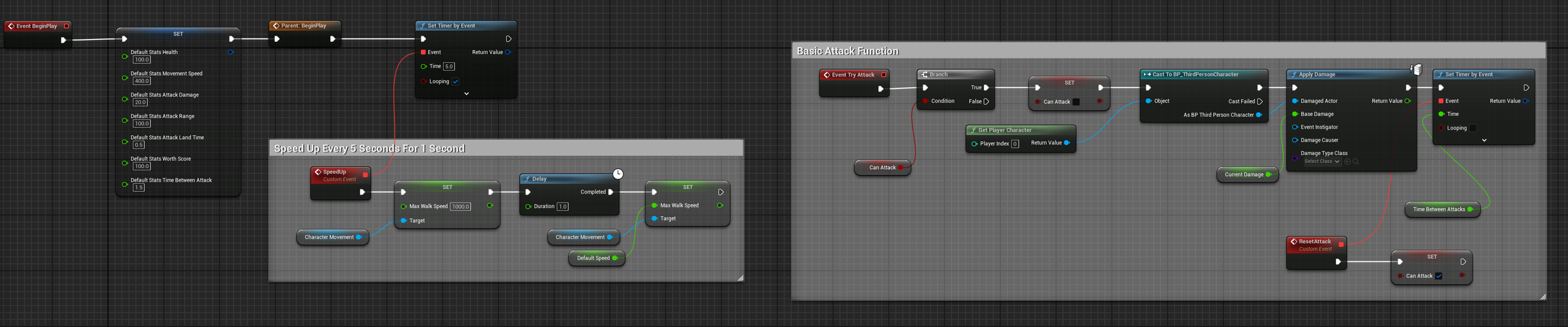 The enemies in this game are all programmed with a simple variation of a singular attack function called by a base parent blueprint, named TryAttack. By adjusting this blueprint and the base stat configuration of each enemy I was able to create a variety of enemies with different mechanics and stats, using very little code.